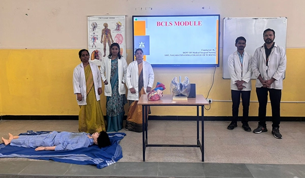 III Semester Nursing students underwent hands-on Basic Cardiac Life Support (BCLS) training, guided by faculty using AHA protocols. The session included CPR and AED demonstrations on manikins, empowering students with vital emergency response skills.